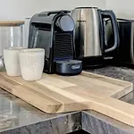 この海辺のアパ-トにある電子レンジ と冷蔵庫のある器具でいっぱいの台所を有しています.